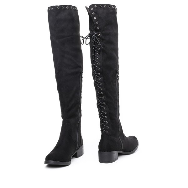 - Wyjątkowe, długie kozaki na płaskim obcasie i wykonane z ekologicznego zamszu. Obuwie zdobione przelotkami i wiązaniami z tyłu i zapinane jest na suwak z boku. W środku delikatne ocieplenie w formie futerka. Pasują zarówno do spodni jak i spódniczek.